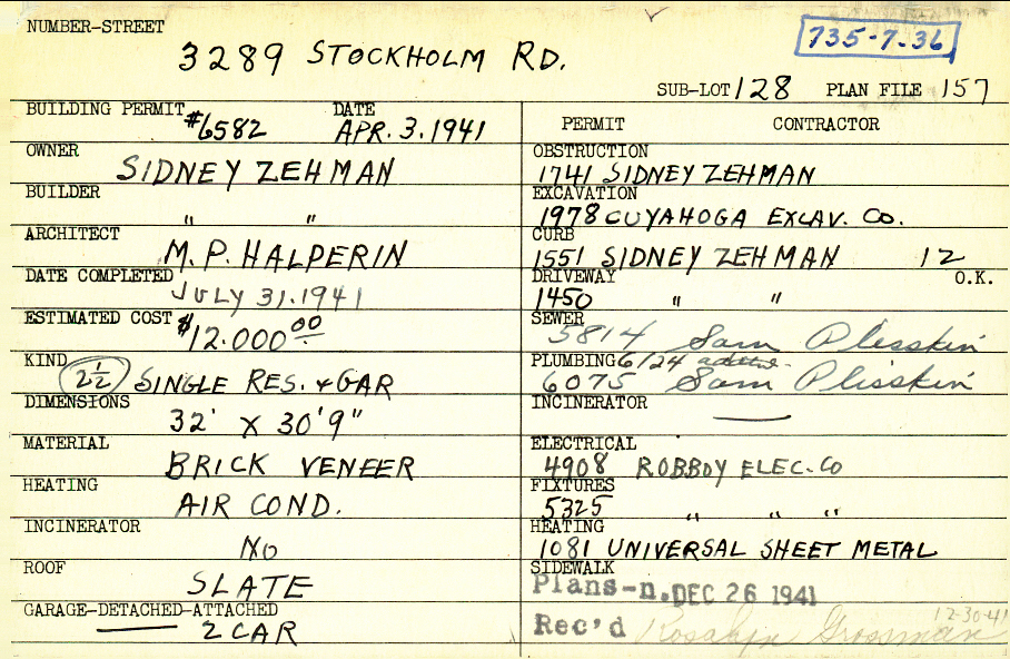 3289 Stockholm Road Shaker Heights, OH 44120 PARCEL ID: 735-07-036 Building Permit Date: 04-03-1941 Plan File Number: 157 Neighborhood: Fernway Owner: Zehman, Sidney Builder: Zehman, Sidney Architect: Halperin, M. P. Estimated Cost: 12000 Date Completed: 07-31-1941 Kind: Single 2-1/2 Material: Brick Veneer Heating: Air Conditioned Roof: Slate Garage: detached 2 car Card Available: yes |