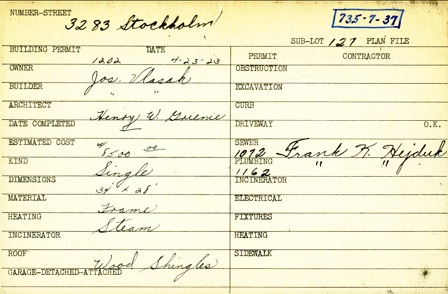 3283 Stockholm Road Shaker Heights, OH 44120 PARCEL ID: 735-07-037 Building Permit Date: 04-23-1923 Plan File Number: 0 Neighborhood: Fernway Owner: Vlasak, Joseph Builder: Vlasak, Joseph Architect: Grieme, Henry W. Estimated Cost: 8500 Kind: Single, Single Residence or Dwelling Material: Frame Heating: Steam Roof: Wood Shingle Card Available: yes |