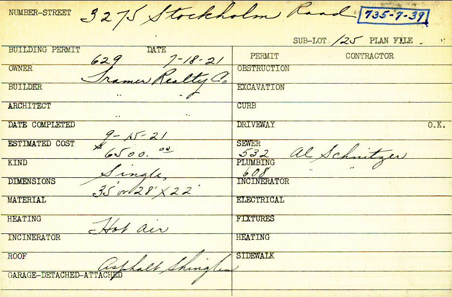 3275 Stockholm Road Shaker Heights, OH 44120 PARCEL ID: 735-07-039 Building Permit Date: 07-18-1921 Plan File Number: 0 Neighborhood: Fernway Owner: Tramer Realty Company Builder: Tramer Realty Company Architect: Tramer Realty Company Estimated Cost: 6500 Date Completed: 09-15-1921 Kind: Single, Single Residence or Dwelling Heating: Hot Air Roof: Asphalt Shingles Card Available: yes |