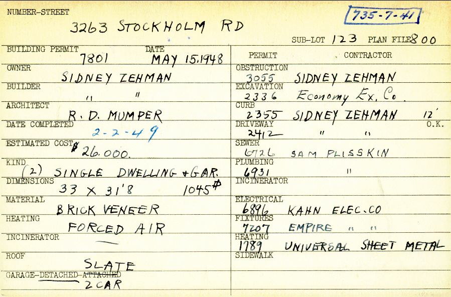 3263 Stockholm Road Shaker Heights, OH 44120 PARCEL ID: 735-07-041 Building Permit Date: 05-15-1948 Plan File Number: 800 all scanned Microfilm Roll: Roll011 Neighborhood: Fernway Owner: Zehman, Sidney Builder: Zehman, Sidney Architect: Mumper, R. D. Estimated Cost: 26000 Date Completed: 02-02-1949 Kind: Single Dwelling and Garage (2) Material: Brick Veneer Heating: Forced Air Roof: Slate Garage: detached 2 car |