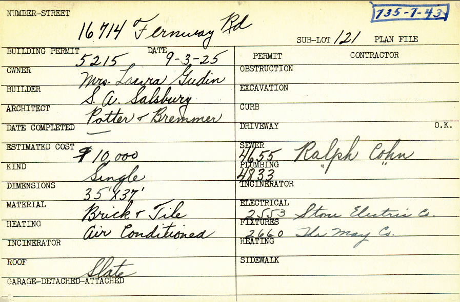16714 Fernway Road Shaker Heights, OH 44120 PARCEL ID: 735-07-043 Building Permit Date: 09-03-1925 Neighborhood: Fernway Owner: Gudin, Mrs. Laura Builder: Salsburg, S. A. Architect: J. Ellsworth Potter and Harry F. Bremmer Estimated Cost: 10000 Kind: Single, Single Residence or Dwelling Material: Brick and tile Heating: Air Conditioned Roof: Slate Blueprints: no blueprints on microfilm |