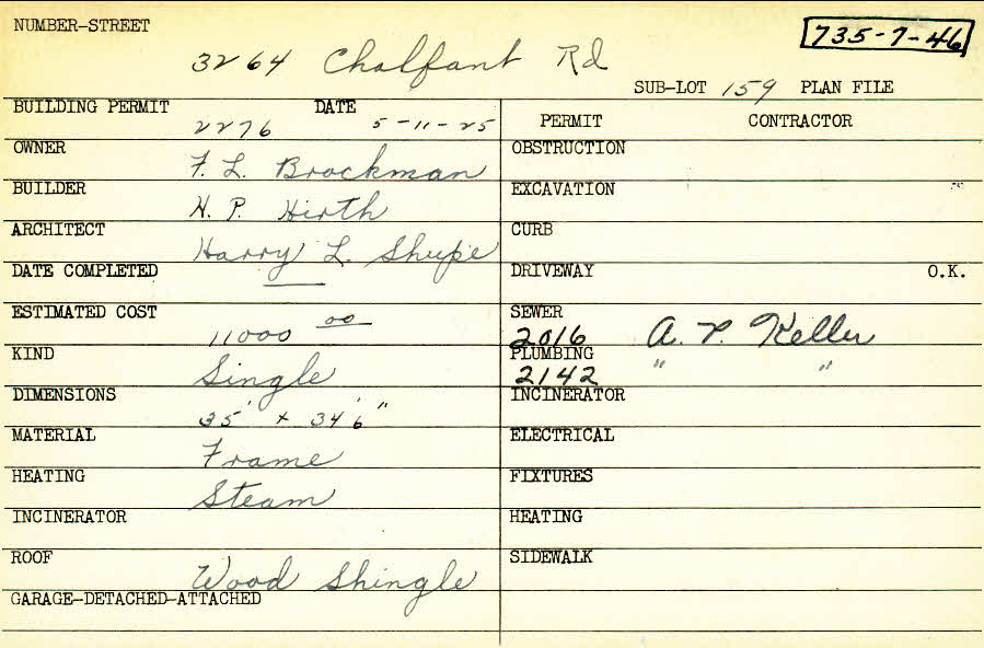 3264 Chalfant Road Shaker Heights, OH 44120 PARCEL ID: 735-07-046 Building Permit Date: 05-11-1925 Plan File Number: 0 Neighborhood: Fernway Owner: Brockman, F. L. Builder: Hirth, H. P. Architect: Shupe, Harry L. Estimated Cost: 11000 Kind: Single, Single Residence or Dwelling Material: Frame Heating: Steam Roof: Wood Shingle Card Available: yes |