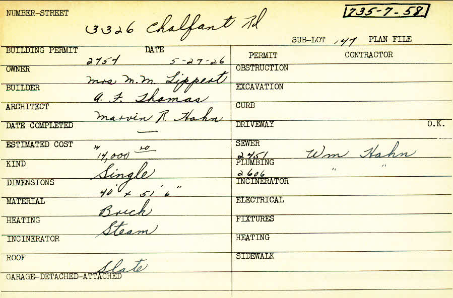 3326 Chalfant Road Shaker Heights, OH 44120 PARCEL ID: 735-07-058 Building Permit Date: 05-27-1926 Plan File Number: 9990 Microfilm Roll: Roll#105 Neighborhood: Fernway Owner: Lippert, Mrs. M. M. Builder: Thomas, A. F. Architect: Hahn, Marvin R. Estimated Cost: 14000 Kind: Single, Single Residence or Dwelling Material: Brick Heating: Steam Roof: Slate Blueprints: online, see link above |