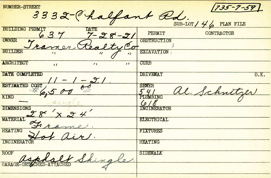 3332 Chalfant Road Shaker Heights, OH 44120 PARCEL ID: 735-07-059 Building Permit Date: 07-28-1921 Plan File Number: 11502 scanned Microfilm Roll: NewRoll07 Neighborhood: Fernway Owner: Tramer Realty Company Builder: Tramer Realty Company Architect: Tramer Realty Company Estimated Cost: 6500 Date Completed: 11-01-1921 Kind: Single, Single Residence or Dwelling Material: Frame Heating: Hot Air Roof: Asphalt Shingles |