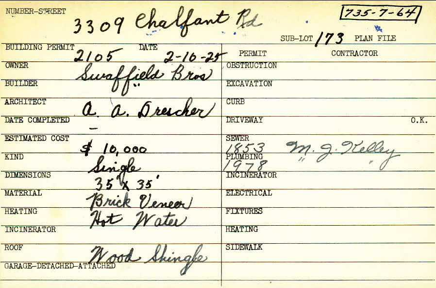 3309 Chalfant Road Shaker Heights, OH 44120 PARCEL ID: 735-07-064 Building Permit Date: 02-10-1925 Plan File Number: 10331 all scanned Microfilm Roll: NewRoll03 Neighborhood: Fernway Owner: Swaffield Brothers Builder: Swaffield Brothers Architect: Drescher, A. A. Estimated Cost: 10000 Kind: Single, Single Residence or Dwelling Material: Brick Veneer Heating: Hot Water Roof: Wood Shingle Blueprints: online, see link above |