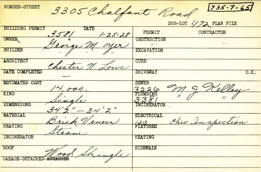 3305 Chalfant Road Shaker Heights, OH 44120 PARCEL ID: 735-07-065 Building Permit Date: 01-25-1928 Plan File Number: 0 Neighborhood: Fernway Owner: Oyer, George M. Builder: Oyer, George M. Architect: Lowe, Chester N. Estimated Cost: 14000 Kind: Single, Single Residence or Dwelling Material: Brick Veneer Heating: Steam Roof: Wood Shingle Garage: detached Card Available: yes |