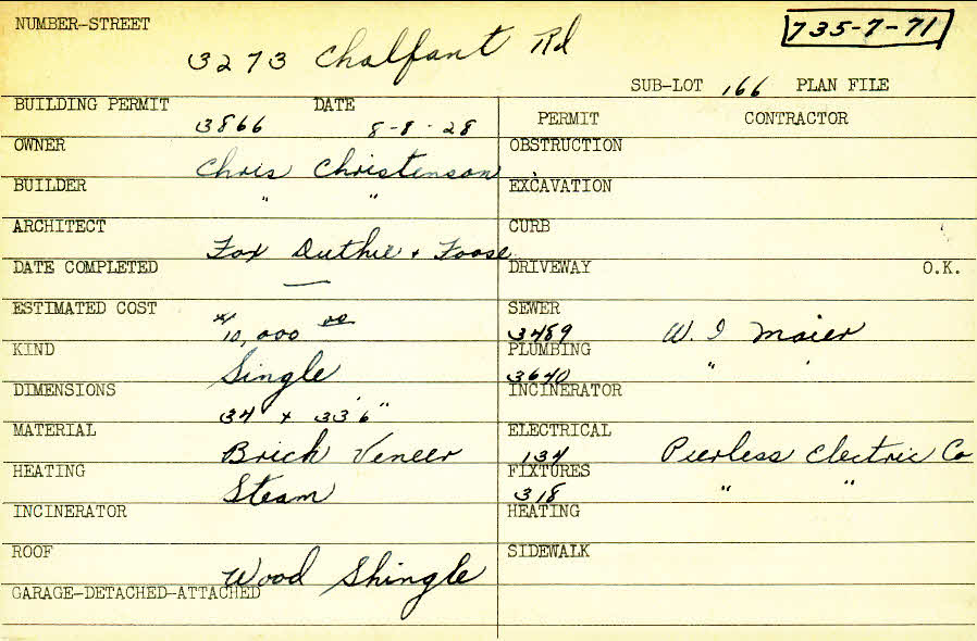 3273 Chalfant Road Shaker Heights, OH 44120 PARCEL ID: 735-07-071 Building Permit Date: 08-08-1928 Plan File Number: 0 Neighborhood: Fernway Owner: Christenson, Chris Builder: Christenson, Chris Architect: Fox, Duthie and Foose Estimated Cost: 10000 Kind: Single, Single Residence or Dwelling Material: Brick Veneer Heating: Steam Roof: Wood Shingle |