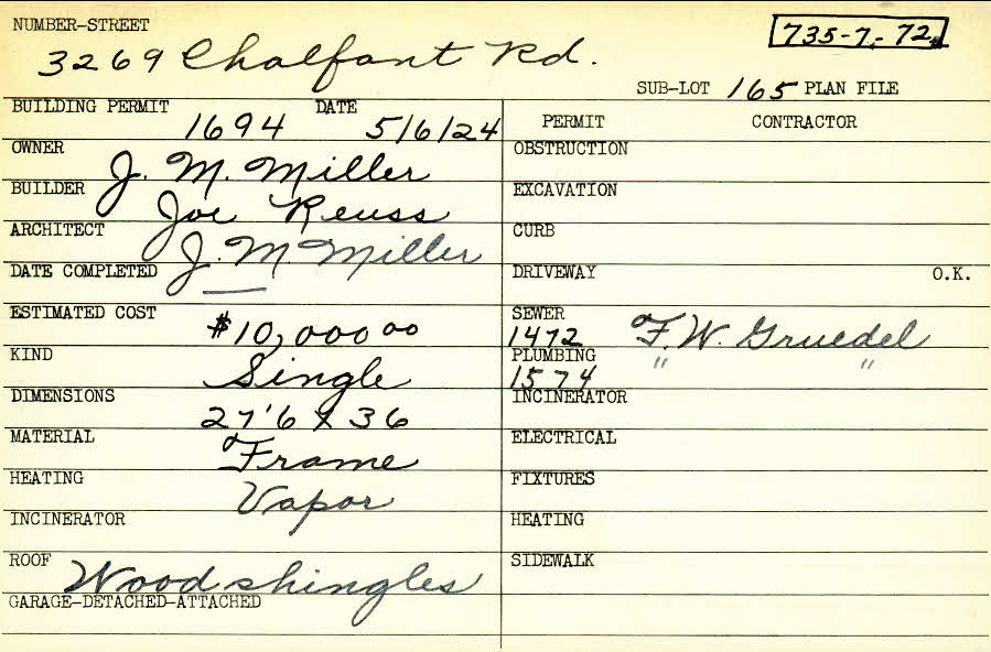 3269 Chalfant Road Shaker Heights, OH 44120 PARCEL ID: 735-07-072 Building Permit Date: 05-06-1924 Plan File Number: 0 Neighborhood: Fernway Owner: Miller, J. M. Builder: Reuss, Joe Architect: Miller, J. M. Estimated Cost: 10000 Kind: Single, Single Residence or Dwelling Material: Frame Heating: Vapor Roof: Wood Shingle Card Available: yes |