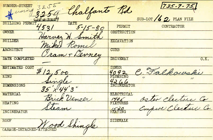 3255 Chalfant Road Shaker Heights, OH 44120 PARCEL ID: 735-07-075 Building Permit Date: 05-15-1930 Plan File Number: 966 all scanned Microfilm Roll: Roll012 Neighborhood: Fernway Owner: Smith, Harvey, H. Builder: Romel, Mike Architect: Oram and Devney Estimated Cost: 12500 Kind: Single, Single Residence or Dwelling Material: Brick Veneer Heating: Steam Roof: Wood Shingle |