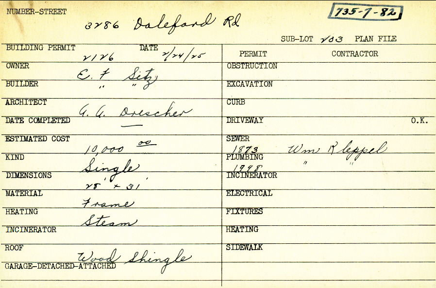 3286 Daleford Road Shaker Heights, OH 44120 PARCEL ID: 735-07-082 Building Permit Date: 02-24-1925 Plan File Number: 10050, 11661 Microfilm Roll: Roll#105, NewRoll#8 Neighborhood: Fernway Owner: Sitz, E. F. Builder: Sitz, E. F. Architect: Drescher, A. A. Estimated Cost: 10000 Kind: Single, Single Residence or Dwelling Material: Frame Heating: Steam Roof: Wood Shingle |