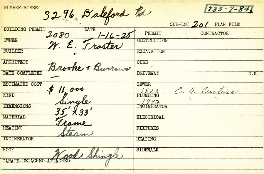 3296 Daleford Road Shaker Heights, OH 44120 PARCEL ID: 735-07-084 Building Permit Date: 01-16-1925 Plan File Number: 0 Neighborhood: Fernway Owner: Traster, W. E. Builder: Traster, W. E. Architect: Brooke and Burrows Estimated Cost: 11000 Kind: Single, Single Residence or Dwelling Material: Frame Heating: Steam Roof: Wood Shingle |