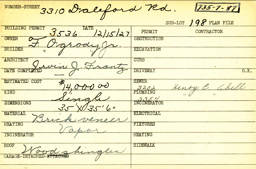 3310 Daleford Road Shaker Heights, OH 44120 PARCEL ID: 735-07-087 Building Permit Date: 12-15-1927 Plan File Number: 0 Neighborhood: Fernway Owner: Ogrody, Frank J. Jr. Builder: Ogrody, Frank J. Jr. Architect: Frantz, Irvin J. Estimated Cost: 14000 Kind: Single, Single Residence or Dwelling Material: Brick Veneer Heating: Vapor Roof: Wood Shingle Garage: detached |