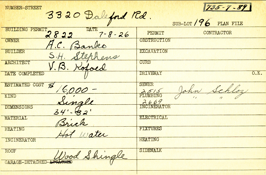 3320 Daleford Road Shaker Heights, OH 44120 PARCEL ID: 735-07-089 Building Permit Date: 07-08-1926 Plan File Number: 0 Neighborhood: Fernway Owner: Banko, A. C. Builder: Stephens, S. H. Architect: Kofoed, V. B. Estimated Cost: 16000 Kind: Single, Single Residence or Dwelling Material: brick Heating: Hot Water Roof: Wood Shingle Garage: detached |