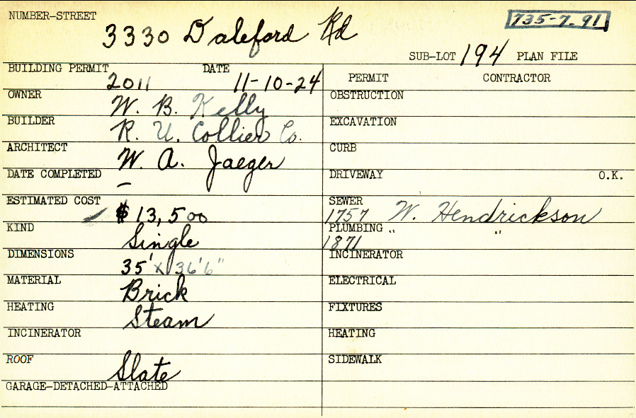 3330 Daleford Road Shaker Heights, OH 44120 PARCEL ID: 735-07-091 Building Permit Date: 11-10-1924 Plan File Number: 0 Neighborhood: Fernway Owner: Kelly, W. B. Builder: R. U. Collier Company Architect: Jaeger, W. A. Estimated Cost: 13500 Kind: Single, Single Residence or Dwelling Material: Brick Heating: Steam Roof: Slate |