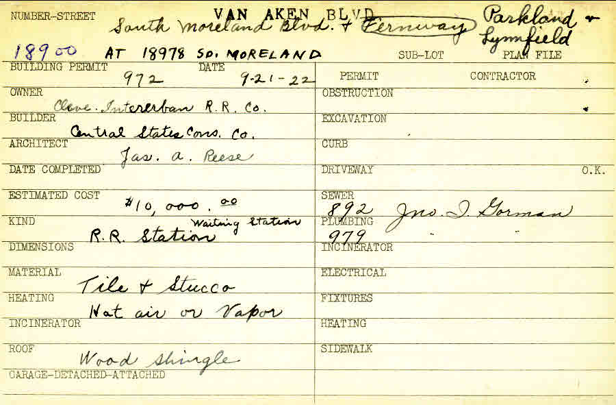 18900 Van Aken Boulevard Shaker Heights, OH 44120 PARCEL ID: 735-08-003 Building Permit Date: 09-21-1922 Plan File Number: 0 Neighborhood: Lomond Owner: Cleveland Interurban Railroad Company Builder: Central States Construction Company Architect: Reese, James A. Estimated Cost: 10000 Material: Tile and Stucco Heating: Hot Air Roof: Wood Shingle |