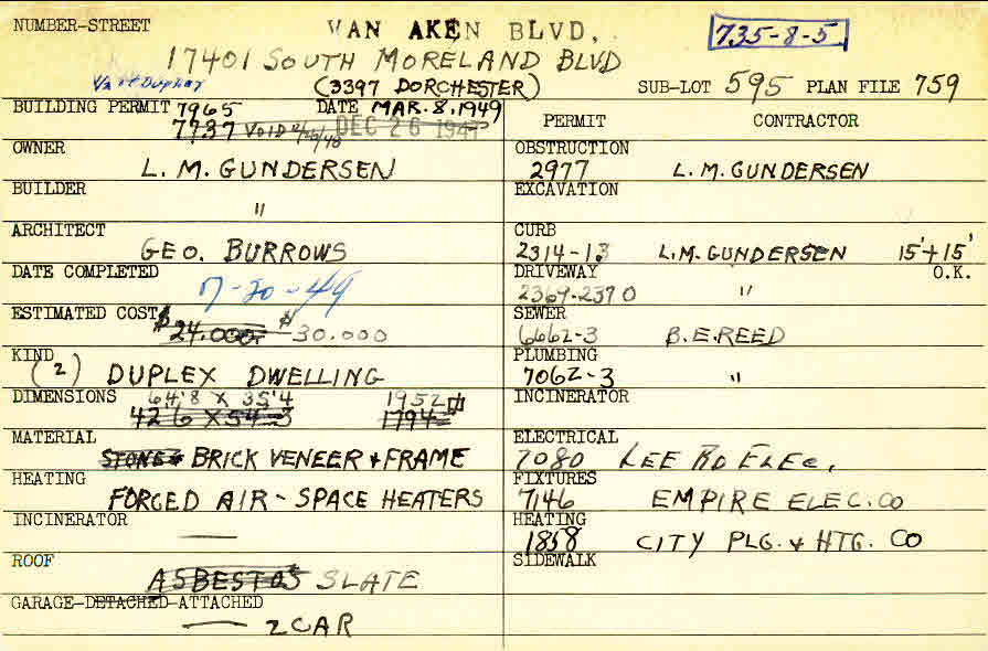 17401 Van Aken Boulevard Shaker Heights, OH 44120 PARCEL ID: 735-08-005 Building Permit Date: 03-08-1949 Plan File Number: 759 scanned, 5119 Microfilm Roll: Roll010, Roll#70 Neighborhood: Lomond Owner: Gundersen, L. M. Builder: Gundersen, L. M. Architect: Burrows, George Estimated Cost: 30000 Date Completed: 07-20-1949 Kind: Duplex or Two-Family Material: Brick Veneer and Frame Heating: Forced Air Roof: Slate Garage: attached 2 car |