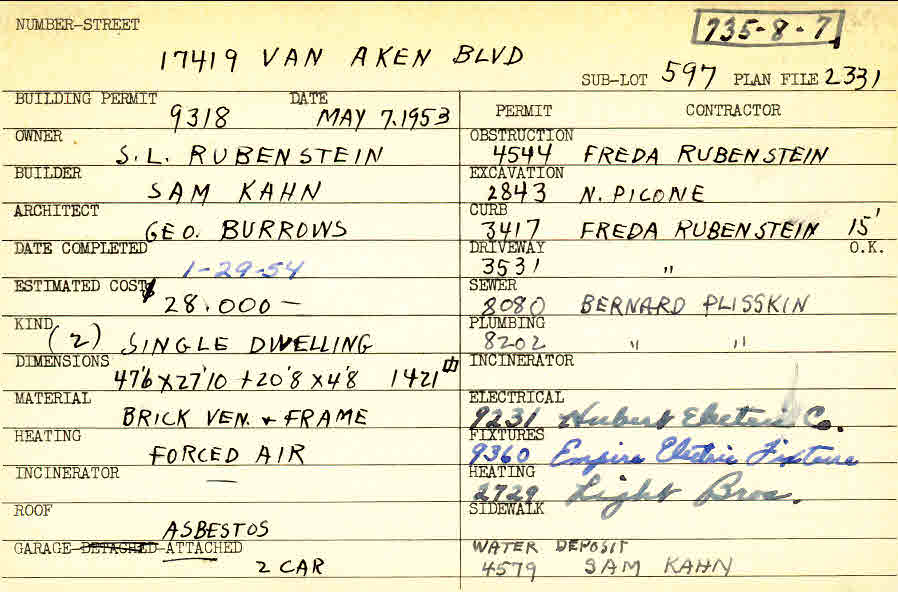 17419 Van Aken Boulevard Shaker Heights, OH 44120 PARCEL ID: 735-08-007 Building Permit Date: 05-07-1953 Plan File Number: 2331, 7222 Microfilm Roll: Roll#34, Roll#92 Neighborhood: Lomond Owner: Rubenstein, S. L. Builder: Kahn, Sam Architect: Burrows, George Estimated Cost: 28000 Date Completed: 01-29-1954 Kind: Single, Single Residence or Dwelling (2) Material: Brick Veneer and Frame Heating: Forced Air Roof: Asbestos Garage: attached 2 car |