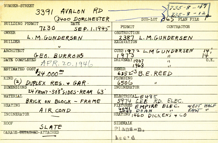 3400 Dorchester Road Shaker Heights, OH 44120 PARCEL ID: 735-08-012 Building Permit Date: 09-01-1945 Plan File Number: 1, 12044 Microfilm Roll: Roll#1, NewRoll#11 Neighborhood: Fernway Owner: Gundersen, L. M. Builder: Gundersen, L. M. Architect: Burrows, George Estimated Cost: 24000 Date Completed: 04-20-1946 Kind: Duplex or Two-Family and Garage Material: Brick on Block and Frame Heating: Air Conditioned Roof: Slate Garage: attached Card Available: Yes |