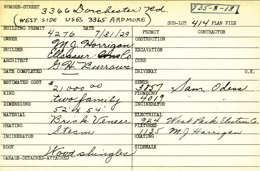 3366 Dorchester Road Shaker Heights, OH 44120 PARCEL ID: 735-08-018 Building Permit Date: 07-31-1929 Plan File Number: 0 Neighborhood: Fernway Owner: Horrigan, M. J. Builder: Ellsasser Construction Company Architect: Burrows, George H. Estimated Cost: 21000 Kind: Duplex or Two-Family Material: Brick Veneer Heating: Steam Roof: Wood Shingle |