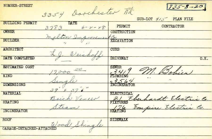 3354 Dorchester Road Shaker Heights, OH 44120 PARCEL ID: 735-08-020 Building Permit Date: 06-02-1928 Plan File Number: 0 Neighborhood: Fernway Owner: Melton Improvement Company Builder: Melton Improvement Company Architect: Weishoff, L. J. Estimated Cost: 17000 Kind: Single, Single Residence or Dwelling Material: Brick Veneer Heating: Steam Roof: Wood Shingle Card Available: yes |