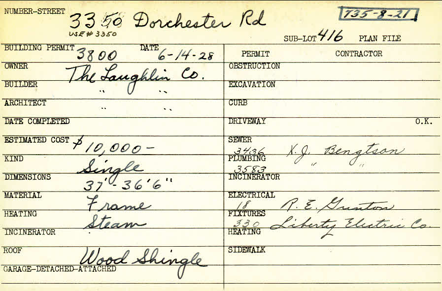 3350 Dorchester Road Shaker Heights, OH 44120 PARCEL ID: 735-08-021 Building Permit Date: 06-14-1928 Plan File Number: 0 Neighborhood: Fernway Owner: The Laughlin Company Builder: The Laughlin Company Architect: The Laughlin Company Estimated Cost: 10000 Kind: Single, Single Residence or Dwelling Material: Frame Heating: Steam Roof: Wood Shingle Card Available: yes |