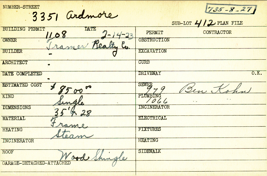 3351 Ardmore Road Shaker Heights, OH 44120 PARCEL ID: 735-08-027 Building Permit Date: 02-14-1923 Plan File Number: 0 Neighborhood: Fernway Owner: Tramer Realty Company Builder: Tramer Realty Company Architect: Tramer Realty Company Estimated Cost: 8500 Kind: Single, Single Residence or Dwelling Material: Frame Heating: Steam Roof: Wood Shingle |