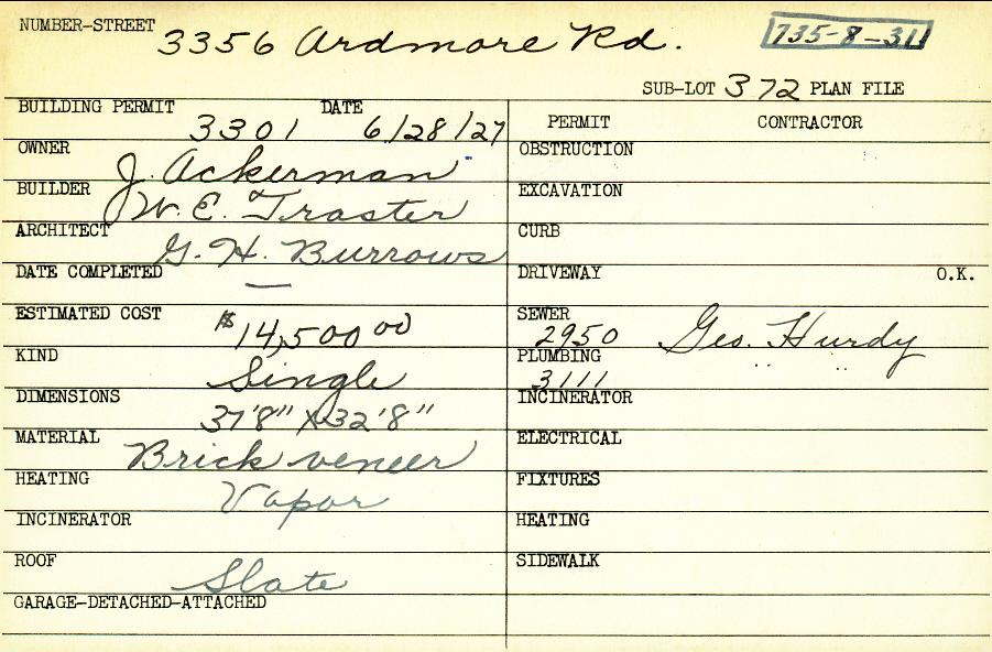 3356 Ardmore Road Shaker Heights, OH 44120 PARCEL ID: 735-08-031 Building Permit Date: 06-28-1927 Plan File Number: 0 Neighborhood: Fernway Owner: Ackerman, J. Builder: Traster, W. E. Architect: Burrows, G. H. Estimated Cost: 14500 Kind: Single, Single Residence or Dwelling Material: Brick veneer Heating: Vapor Roof: Slate |