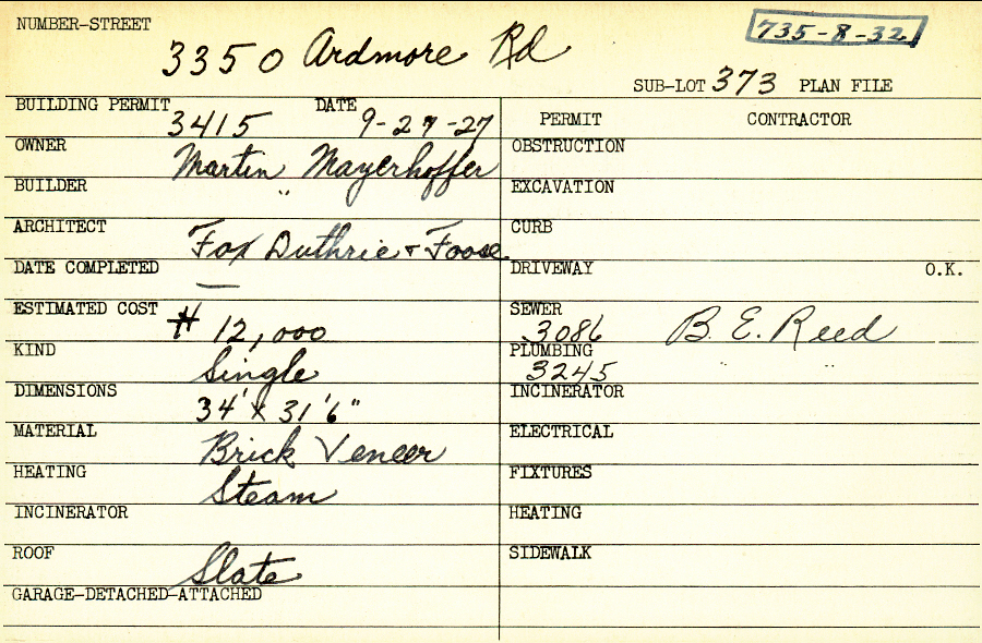 3350 Ardmore Road Shaker Heights, OH 44120 PARCEL ID: 735-08-032 Building Permit Date: 09-27-1927 Plan File Number: 5193 scanned Microfilm Roll: Roll#70 Neighborhood: Fernway Owner: Mayerhoffer, Martin Builder: Mayerhoffer, Martin Architect: Fox, Duthrie and Foose Estimated Cost: 12000 Kind: Single, Single Residence or Dwelling Material: Brick veneer Heating: Steam Roof: Slate |