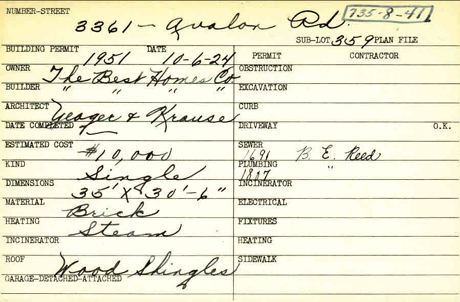 3361 Avalon Road Shaker Heights, OH 44120 PARCEL ID: 735-08-041 Building Permit Date: 10-06-1924 Plan File Number: 0 Neighborhood: Fernway Owner: The Best Homes Company Builder: The Best Homes Company Architect: Yeager and Krause Estimated Cost: 10000 Kind: Single, Single Residence or Dwelling Material: Brick Heating: Steam Roof: Wood Shingle  |