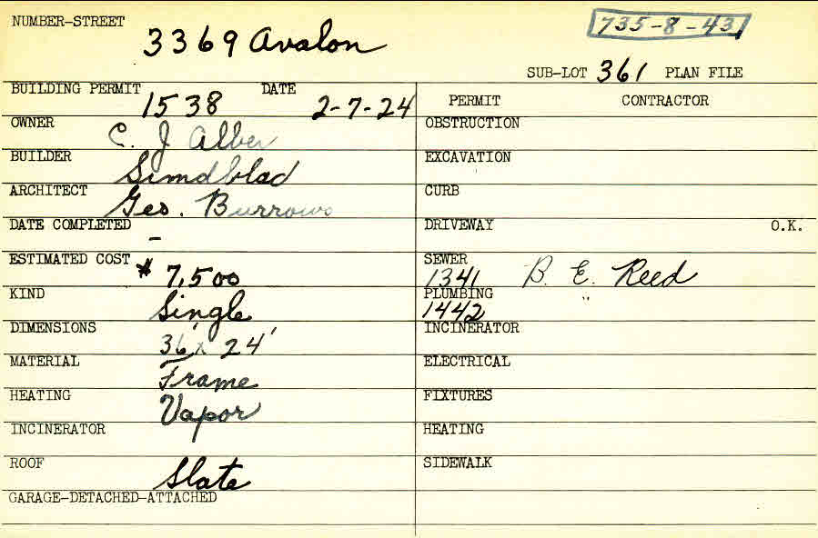 3369 Avalon Road Shaker Heights, OH 44120 PARCEL ID: 735-08-043 Building Permit Date: 02-07-1924 Plan File Number: 0 Neighborhood: Fernway Owner: Alber, C. J. Builder: Simdblad Architect: Burrows, George Estimated Cost: 7500 Kind: Single, Single Residence or Dwelling Material: Frame Heating: Vapor Roof: Slate  |