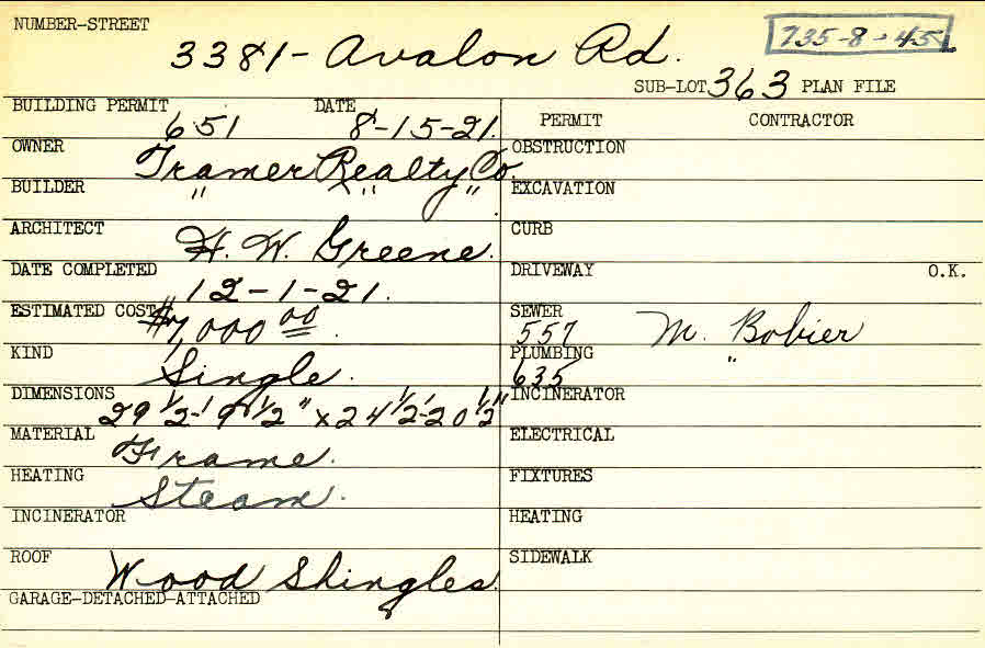 3381 Avalon Road Shaker Heights, OH 44120 PARCEL ID: 735-08-045 Building Permit Date: 08-15-1921 Plan File Number: 0 Neighborhood: Fernway Owner: Tramer Realty Company Builder: Tramer Realty Company Architect: Greene, H. W. Estimated Cost: 7000 Date Completed: 12-01-1921 Kind: Single, Single Residence or Dwelling Material: Frame Heating: Steam Roof: Wood Shingle  |