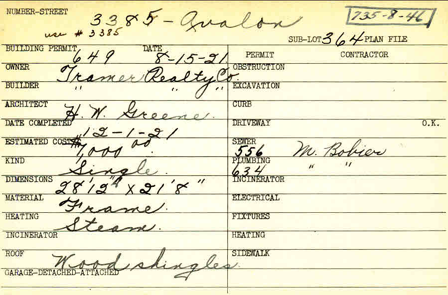 3385 Avalon Road Shaker Heights, OH 44120 PARCEL ID: 735-08-046 Building Permit Date: 08-15-1921 Plan File Number: 0 Neighborhood: Fernway Owner: Tramer Realty Company Builder: Tramer Realty Company Architect: Greene, H. W. Estimated Cost: 7000 Date Completed: 12-01-1921 Kind: Single, Single Residence or Dwelling Material: Frame Heating: Steam Roof: Wood Shingle  |