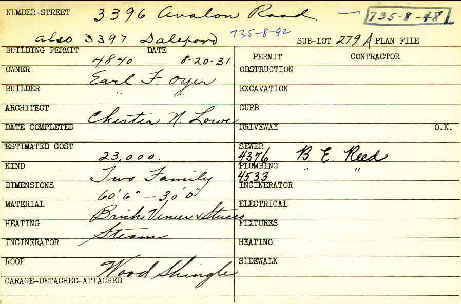 3396 Avalon Road Shaker Heights, OH 44120 PARCEL ID: 735-08-048 Building Permit Date: 08-20-1931 Plan File Number: 0 Neighborhood: Fernway Owner: Oyer, Earl F. Builder: Oyer, Earl F. Architect: Lowe, Chester N. Estimated Cost: 23000 Kind: Duplex or Two-Family Material: Brick Veneer and Stucco Heating: Steam Roof: Wood Shingle Card Available: yes  |