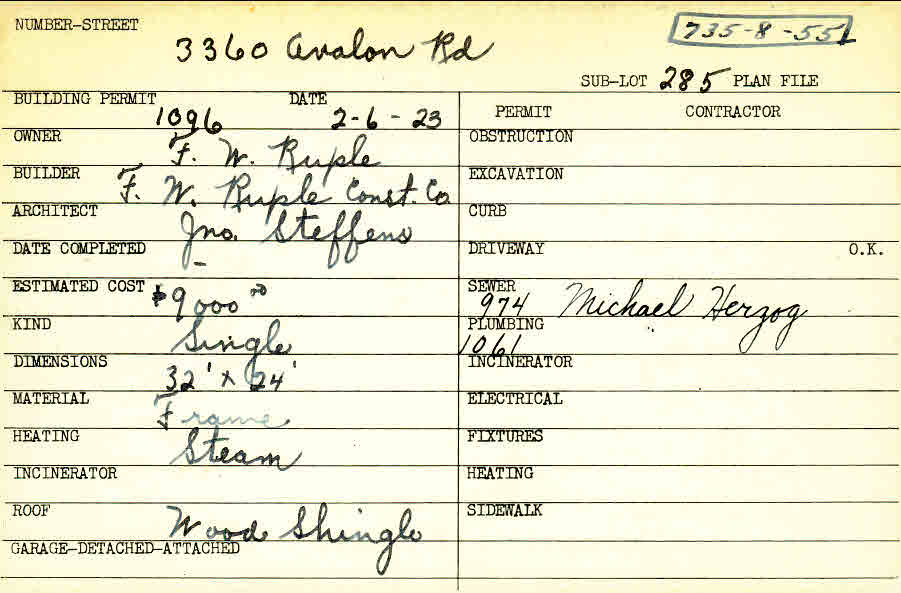 3360 Avalon Road Shaker Heights, OH 44120 PARCEL ID: 735-08-055 Building Permit Date: 02-06-1923 Plan File Number: 9787 Microfilm Roll: Roll#104 Neighborhood: Fernway Owner: Ruple, F. W. Builder: F. W. Ruple Construction Company Architect: Steffens, John Estimated Cost: 9000 Kind: Single, Single Residence or Dwelling Material: Frame Heating: Steam Roof: Wood Shingle  |