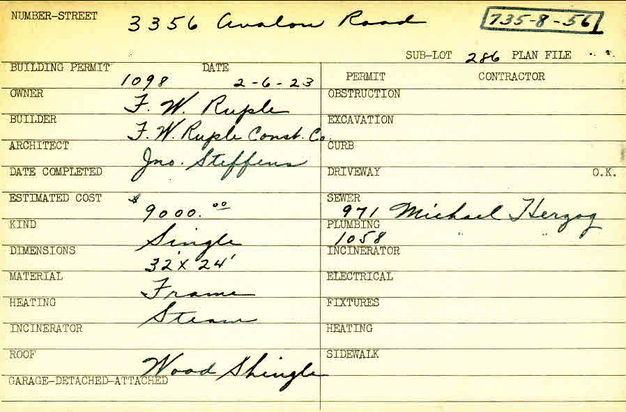 3356 Avalon Road Shaker Heights, OH 44120 PARCEL ID: 735-08-056 Building Permit Date: 02-06-1923 Plan File Number: 0 Neighborhood: Fernway Owner: Ruple, F. W. Builder: F. W. Ruple Construction Company Architect: Steffens, John Estimated Cost: 9000 Kind: Single, Single Residence or Dwelling Material: Frame Heating: Steam Roof: Wood Shingle  |
