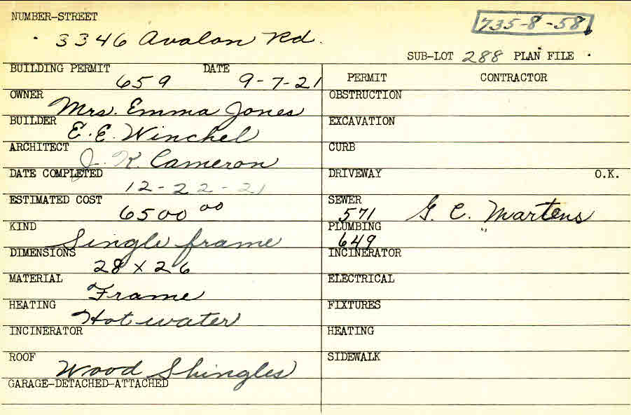 3346 Avalon Road Shaker Heights, OH 44120 PARCEL ID: 735-08-058 Building Permit Date: 09-07-1921 Plan File Number: 3224, 4167, 10933, 12464 Microfilm Roll: Roll#47, Roll#61, NewRoll#6, NewRoll#13 Neighborhood: Fernway Owner: Jones, Mrs. Emma Builder: Winchel, E. E. Architect: Cameron, J. K. Estimated Cost: 6500 Date Completed: 12-22-1921 Kind: Single, Single Residence or Dwelling Material: Frame Heating: Hot Water Roof: Wood Shingle  |