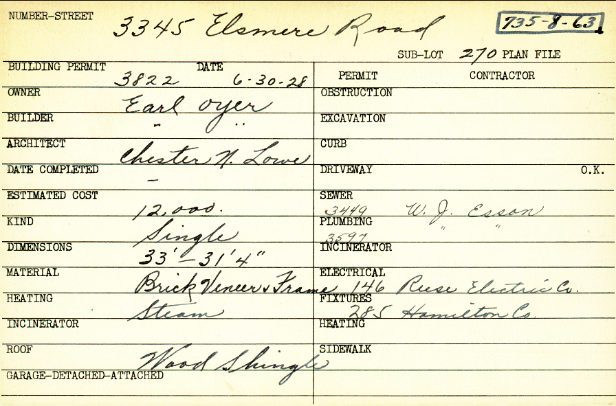 3345 Elsmere Road Shaker Heights, OH 44120 PARCEL ID: 735-08-063 Building Permit Date: 06-30-1928 Plan File Number: 0 Neighborhood: Fernway Owner: Oyer, Earl F. Builder: Oyer, Earl F. Architect: Lowe, Chester N. Estimated Cost: 12000 Kind: Single, Single Residence or Dwelling Material: Brick Veneer and Frame Heating: Steam Roof: Wood Shingle |