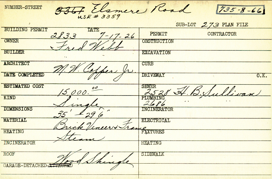 3359 Elsmere Road Shaker Heights, OH 44120 PARCEL ID: 735-08-066 Building Permit Date: 07-17-1926 Plan File Number: 0 Neighborhood: Fernway Owner: Webb, Fred Builder: Webb, Fred Architect: Copper, Munroe Walker Jr. Estimated Cost: 15000 Kind: Single, Single Residence or Dwelling Material: Brick Veneer and Frame Heating: Steam Roof: Wood Shingle Garage: detached |