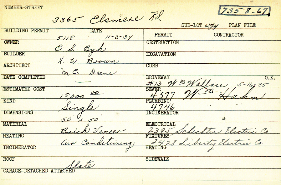 3365 Elsmere Road Shaker Heights, OH 44120 PARCEL ID: 735-08-067 Building Permit Date: 11-03-1934 Plan File Number: 0 Neighborhood: Fernway Owner: Byk, E. S. Builder: Brown, H. W. Architect: Deane, Monroe Ensign Estimated Cost: 18000 Kind: Single, Single Residence or Dwelling Material: Brick Veneer Heating: Air Conditioned Roof: Slate |