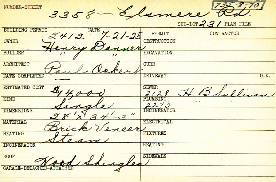 3358 Elsmere Road Shaker Heights, OH 44120 PARCEL ID: 735-08-070 Building Permit Date: 07-21-1925 Plan File Number: 0 Neighborhood: Fernway Owner: Danner, Henry Builder: Danner, Henry Architect: Ockert, Paul Estimated Cost: 14000 Kind: Single, Single Residence or Dwelling Material: Brick Veneer Heating: Steam Roof: Wood Shingle Card Available: yes |