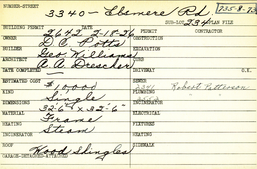 3340 Elsmere Road Shaker Heights, OH 44120 PARCEL ID: 735-08-073 Building Permit Date: 02-18-1926 Plan File Number: 7134 Microfilm Roll: Roll#91 Neighborhood: Fernway Owner: Potts, D. C. Builder: Williams, George Architect: Drescher, A. A. Estimated Cost: 10000 Kind: Single, Single Residence or Dwelling Material: Frame Heating: Steam Roof: Wood Shingle |