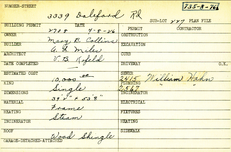 3339 Daleford Road Shaker Heights, OH 44120 PARCEL ID: 735-08-076 Building Permit Date: 04-08-1926 Plan File Number: 4294 all scanned Microfilm Roll: Roll062 Neighborhood: Fernway Owner: Collins, Mary B. Builder: Miles, A. L. Architect: Kofeld, V. B. Estimated Cost: 10000 Kind: Single, Single Residence or Dwelling Material: Frame Heating: Steam Roof: Wood Shingle |