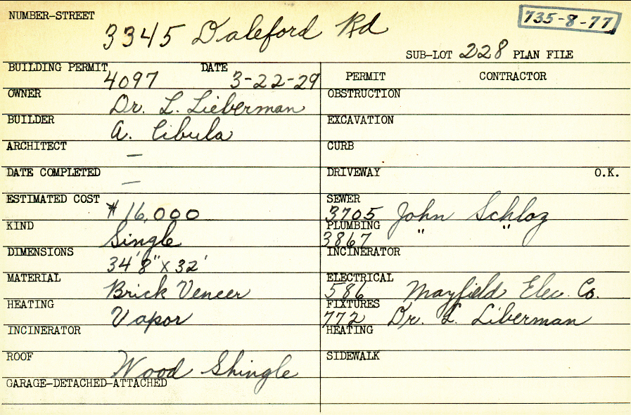 3345 Daleford Road Shaker Heights, OH 44120 PARCEL ID: 735-08-077 Building Permit Date: 03-22-1929 Plan File Number: 0 Neighborhood: Fernway Owner: Lieberman, Dr. L. Builder: Cibula, A. Estimated Cost: 16000 Kind: Single, Single Residence or Dwelling Material: Brick Veneer Heating: Vapor Roof: Wood Shingle |