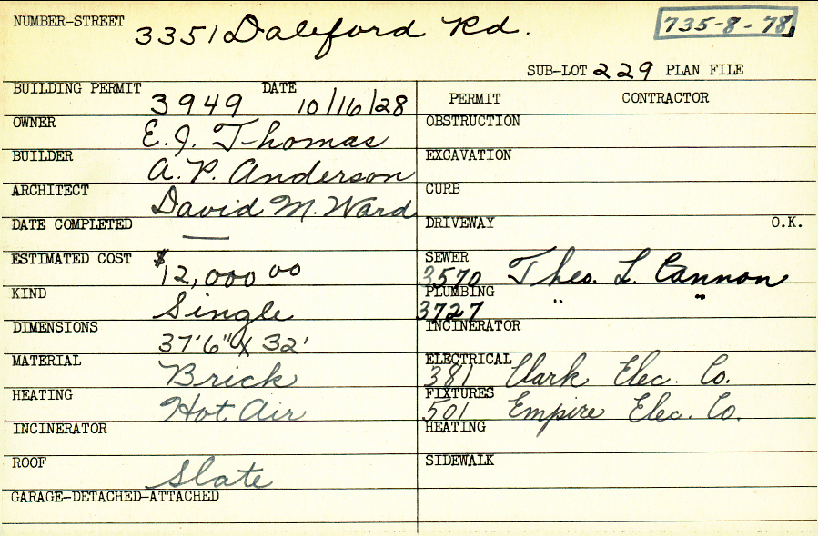 3351 Daleford Road Shaker Heights, OH 44120 PARCEL ID: 735-08-078 Building Permit Date: 10-16-1928 Plan File Number: 0 Neighborhood: Fernway Owner: Thomas, E. J. Builder: Anderson, A. P. Architect: Ward, David M. Estimated Cost: 12000 Kind: Single, Single Residence or Dwelling Material: Brick Heating: Hot Air Roof: Slate |