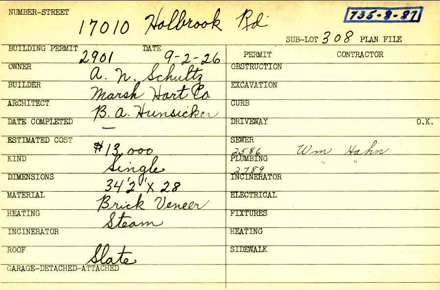 17010 Holbrook Road Shaker Heights, OH 44120 PARCEL ID: 735-08-087 Building Permit Date: 09-02-1926 Plan File Number: 9682 Microfilm Roll: Roll#104 Neighborhood: Fernway Owner: Schultz, A. N. Builder: Marsh Hart Company Architect: Hunsicker, B. A. Estimated Cost: 13000 Kind: Single, Single Residence or Dwelling Material: Brick Veneer Heating: Steam Roof: Slate |