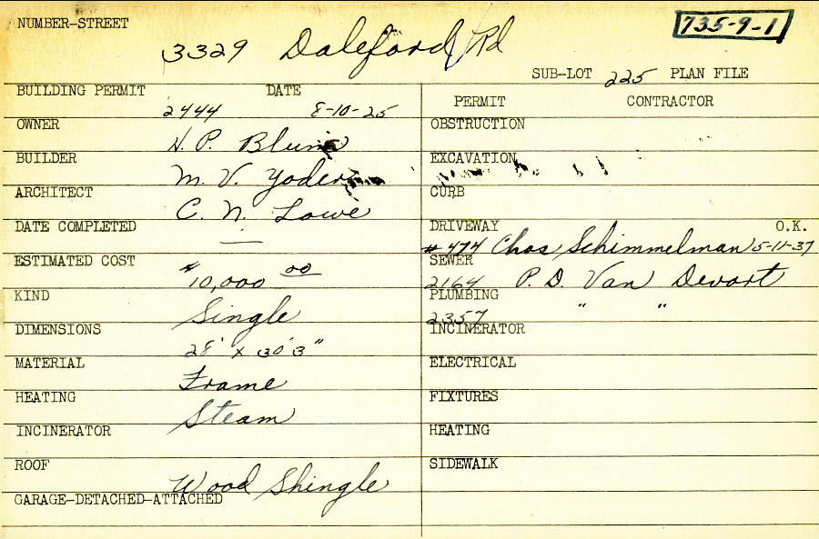 3329 Daleford Road Shaker Heights, OH 44120 PARCEL ID: 735-09-001 Building Permit Date: 08-10-1925 Plan File Number: 4807 Microfilm Roll: Roll#66 Neighborhood: Fernway Owner: Blum, H. P. Builder: Yoder, M. V. Architect: Lowe, C. N. Estimated Cost: 10000 Kind: Single, Single Residence or Dwelling Material: Frame Heating: Steam Roof: Wood Shingle |