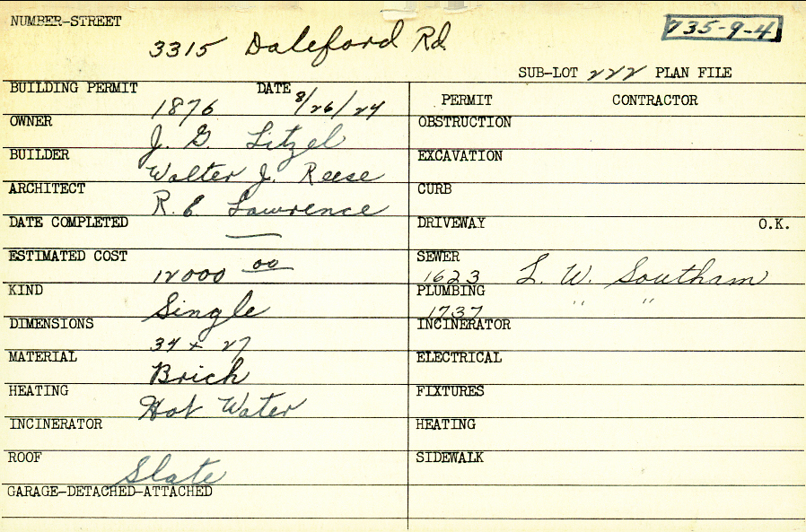 3315 Daleford Road Shaker Heights, OH 44120 PARCEL ID: 735-09-004 Building Permit Date: 08-26-1924 Plan File Number: 0 Neighborhood: Fernway Owner: Litzel, J. B. Builder: Reese, Walter J. Architect: Lawrence, Ralph E. Estimated Cost: 12000 Kind: Single, Single Residence or Dwelling Material: Brick Heating: Hot Water Roof: Slate |