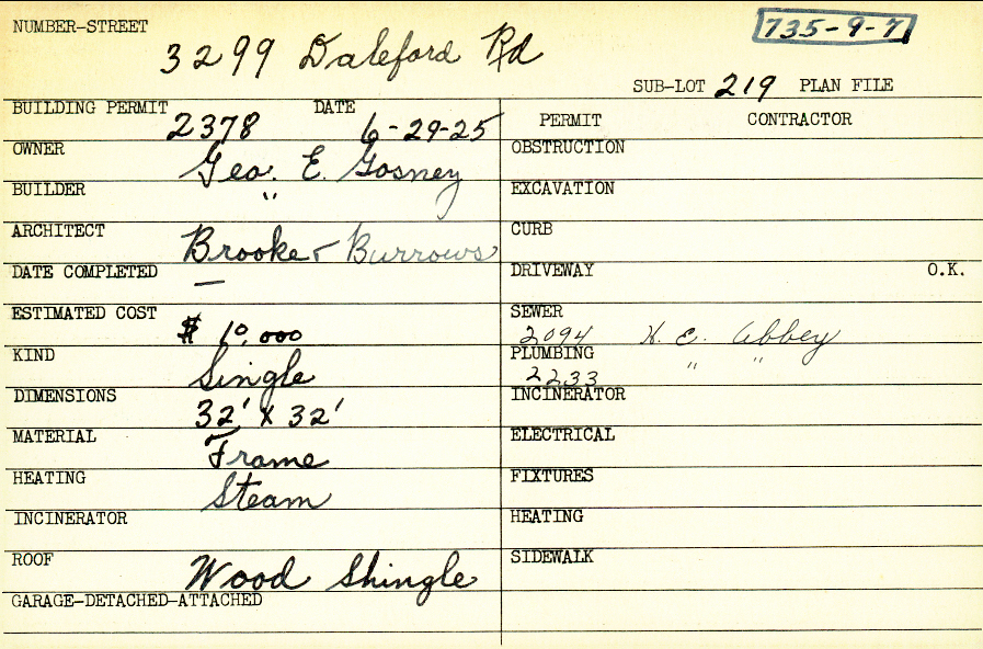 3299 Daleford Road Shaker Heights, OH 44120 PARCEL ID: 735-09-007 Building Permit Date: 06-29-1925 Plan File Number: 4976 Microfilm Roll: Roll#68 Neighborhood: Fernway Owner: Gosney, George E. Builder: Gosney, George E. Architect: Brooke and Burrows Estimated Cost: 10000 Kind: Single, Single Residence or Dwelling Material: Frame Heating: Steam Roof: Wood Shingle |
