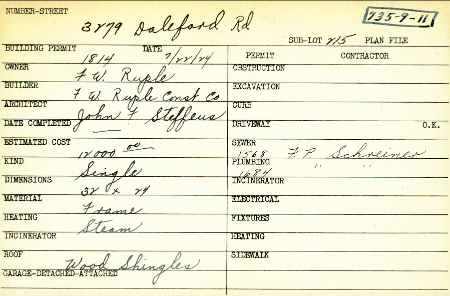 3279 Daleford Road Shaker Heights, OH 44120 PARCEL ID: 735-09-011 Building Permit Date: 07-22-1924 Plan File Number: 10778 Microfilm Roll: NewRoll#5 Neighborhood: Fernway Owner: Ruple, F. W. Builder: F. W. Ruple Construction Company Architect: Steffens, John F. Estimated Cost: 12000 Kind: Single, Single Residence or Dwelling Material: Frame Heating: Steam Roof: Wood Shingle |