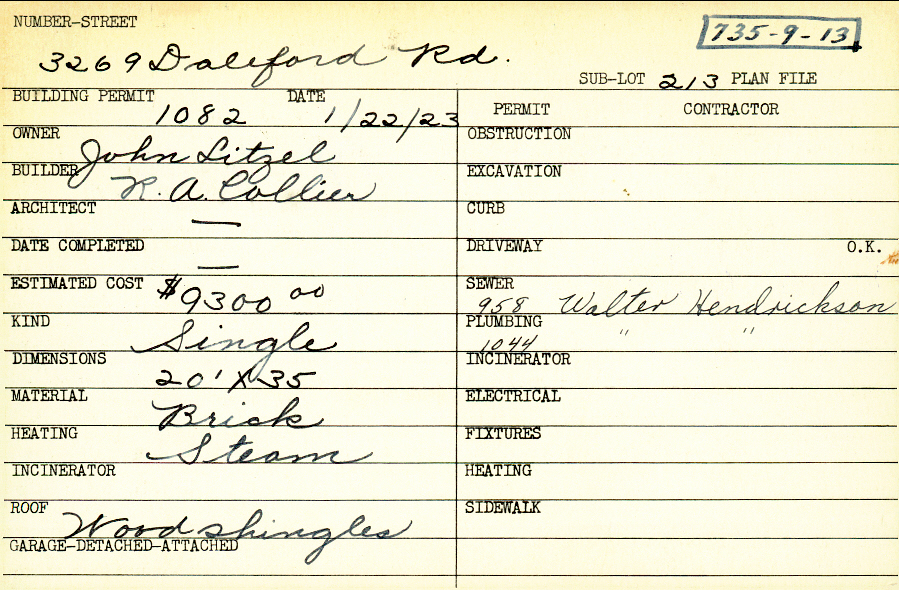 3269 Daleford Road Shaker Heights, OH 44120 PARCEL ID: 735-09-013 Building Permit Date: 01-22-1923 Plan File Number: 0 Neighborhood: Fernway Owner: Litzel, John Builder: Collier, R. A. Estimated Cost: 9300 Kind: Single, Single Residence or Dwelling Material: Brick Heating: Steam Roof: Wood Shingle |
